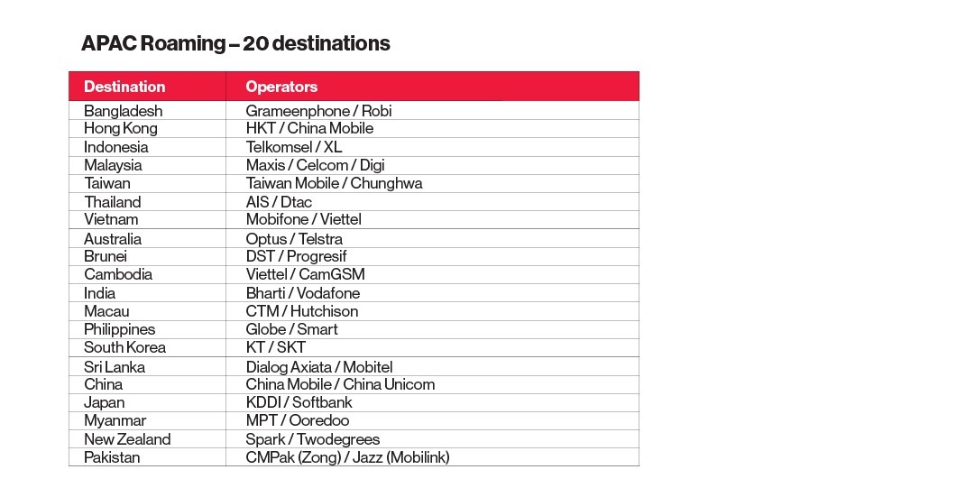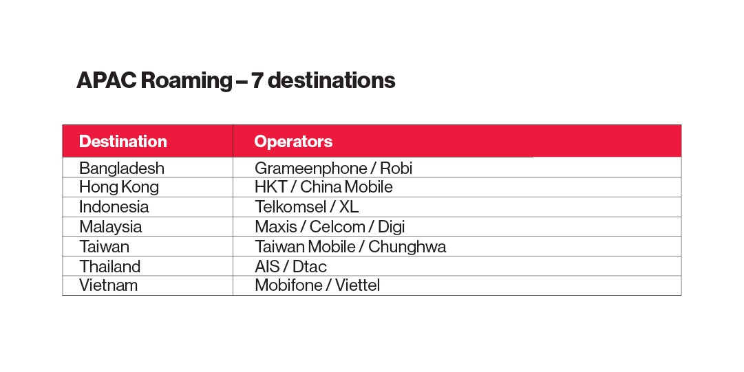 | APAC Data (7 Destinations) Bangladesh, Hong Kong, Indonesia, Malaysia, Taiwan, Thailand, Vietnam | 3GB |