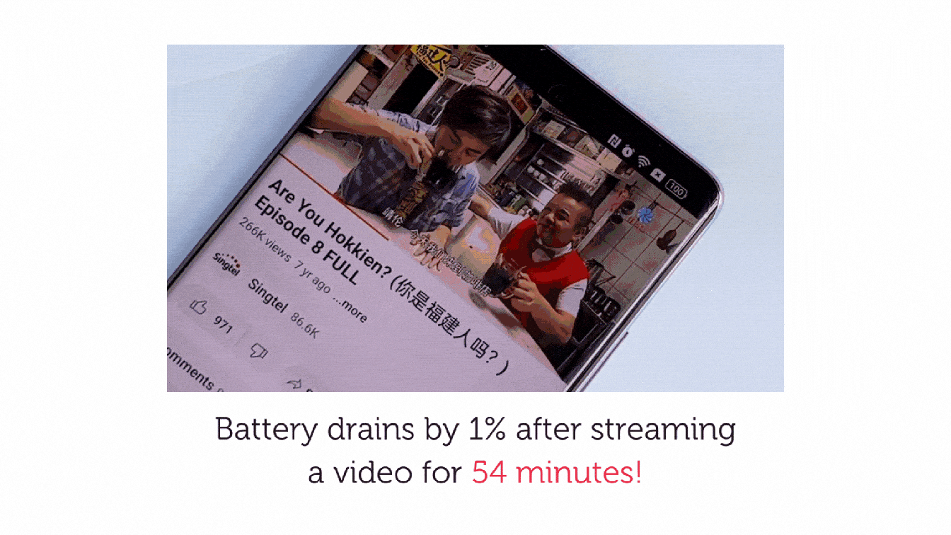 We tested it by streaming a video – and the battery only drained by 1% after 54 minutes of streaming 🤯
